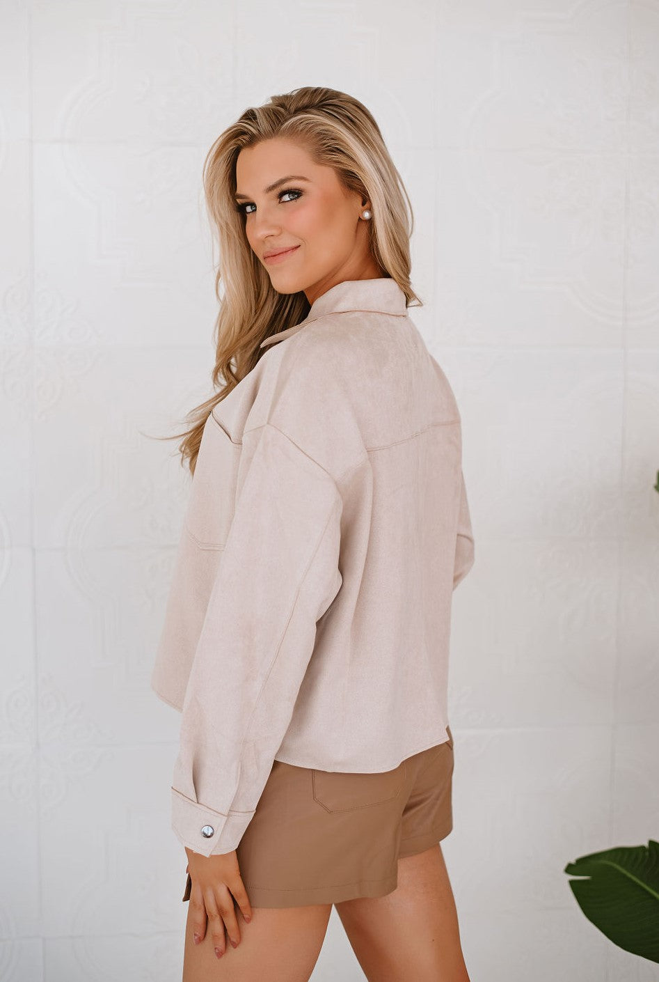 Make a statement with this beautiful, suede jacket. Comes with button up closure and front pockets. You can tuck in with a belt for a blouse style look or wear open with a layering piece. Cream color.