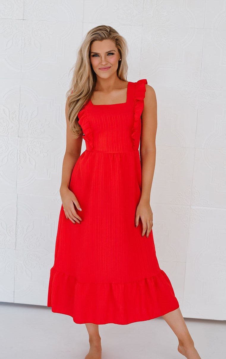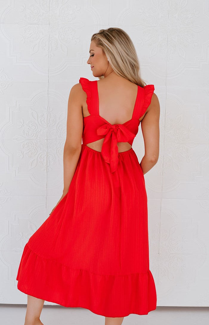 Beautiful dress with comfortable material...yes please! We love this girlie girl dress with its ruffle sleeves and cross back bow. Every closet should have this dress.