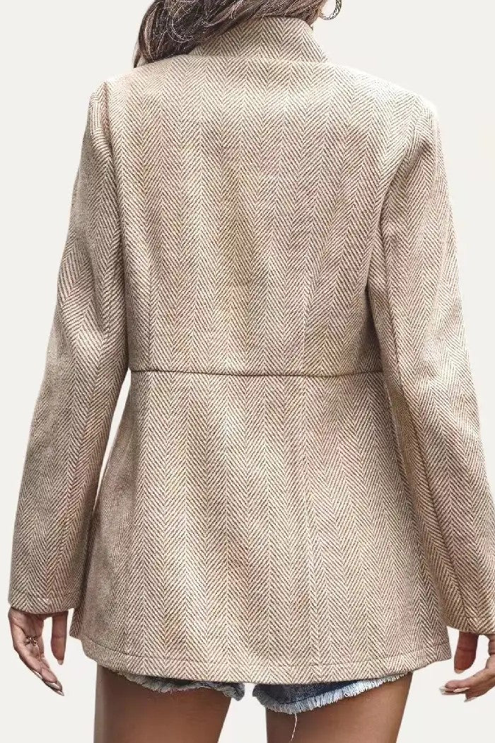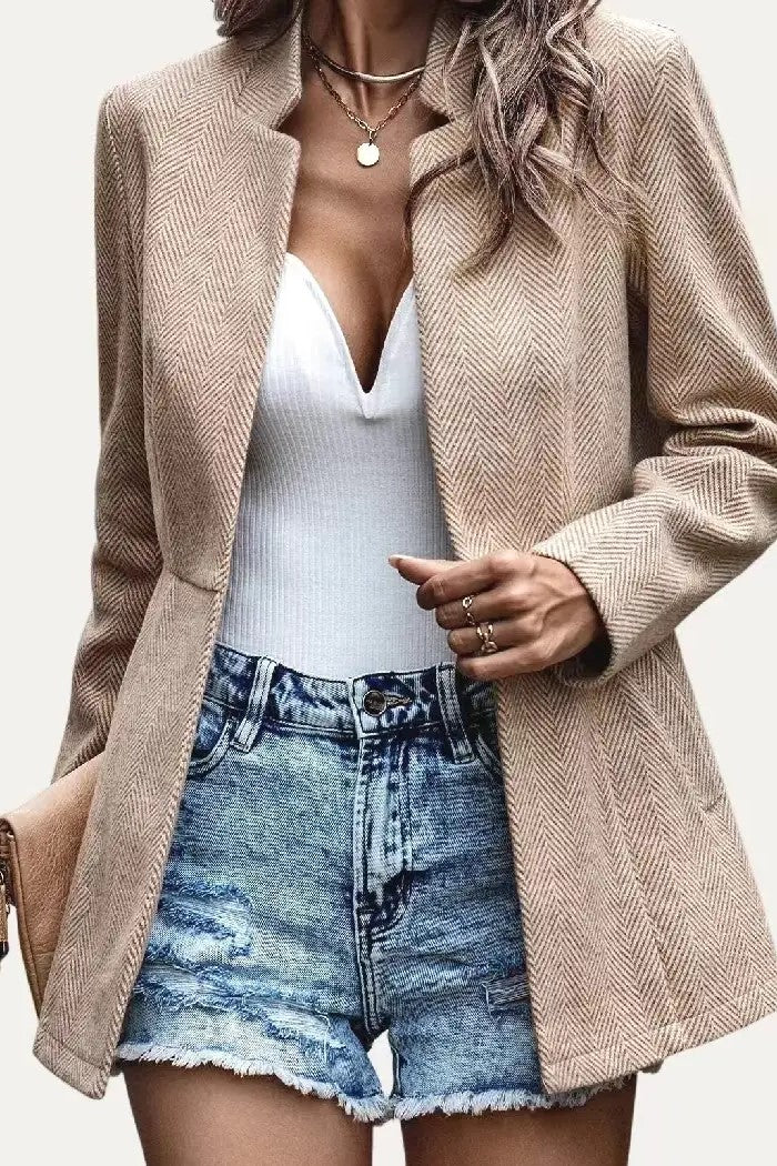 This chic blazer features a mock neck and open front. Enjoy decorative pockets with a fitted Bodice. Blazer is mid-weight.
