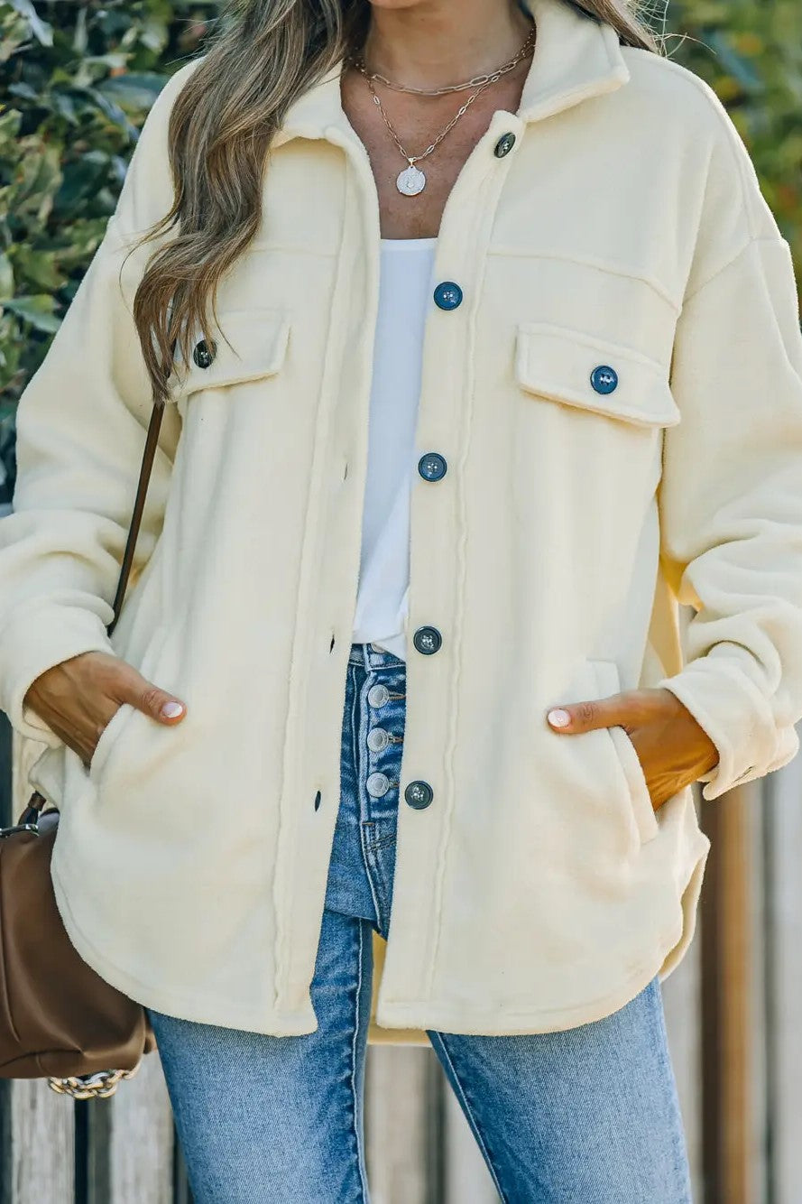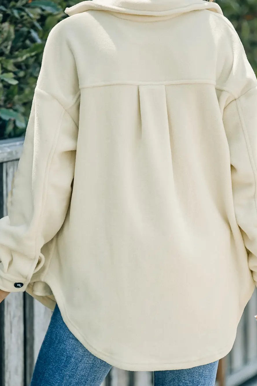 Basic shirt jacket style with the long sleeve and turn down collar. Side pockets and flip pockets in the front. Great layering piece!