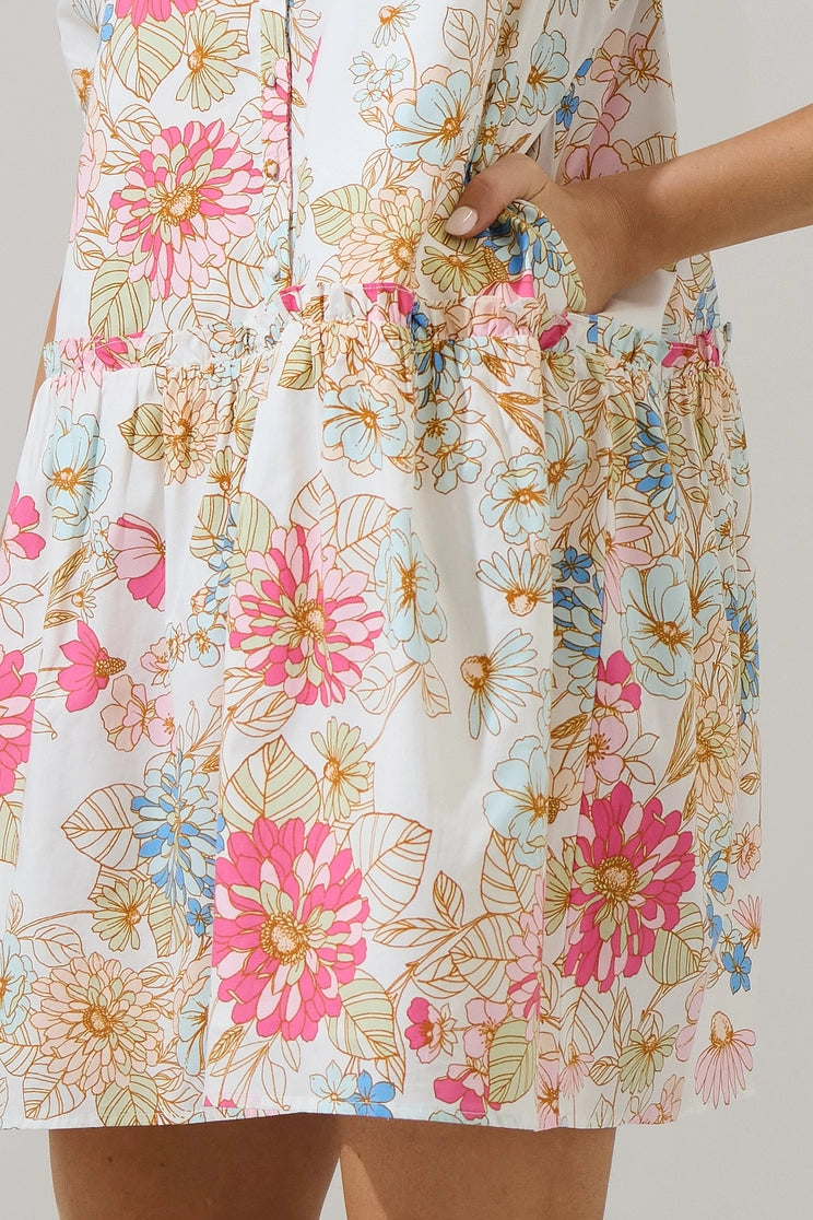 You won't get enough of the Day Lily Fleda Shift Mini Dress. A beautiful light multi floral print designs this mini dress with short bubble sleeves, ruffle neck and a button up front with a shift style bottom. Comes with pockets!