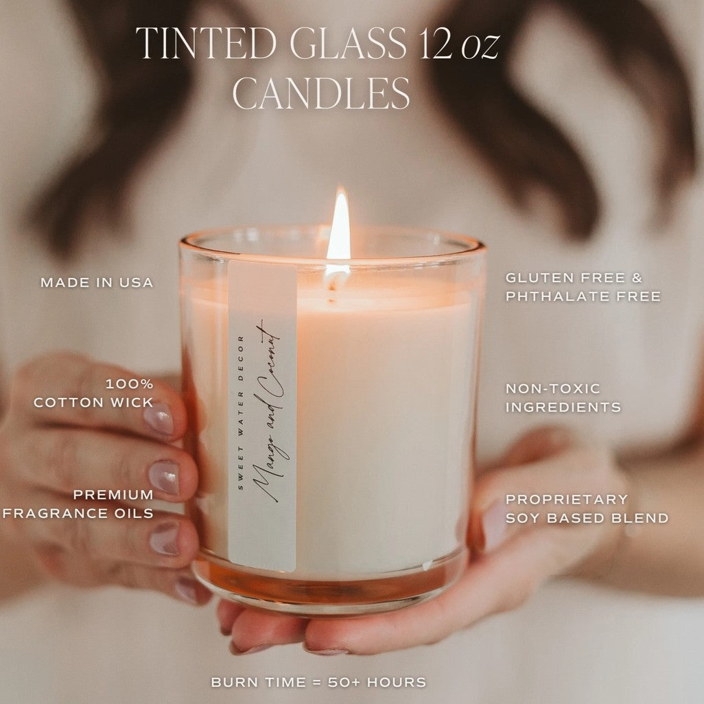 Volume 12oz | 3.4 x 3.4 x 4" • Burn Time: 50+ Hours • Tinted Beige Glass Jar • Wick: 100% Cotton (Lead & Zinc Free) • Wax: Proprietary Soy Based Wax Blend | Vegan, Non-GMO, Kosher • Premium Fragrance Oil • Gluten Free, Phthalate Free, Non-Toxic • Wood lid included