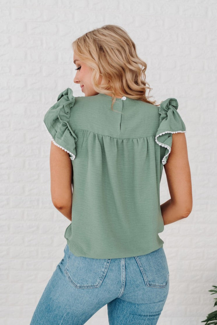 Don't miss out on this darling green blouse! The delicate pleats along the neckline and the ruffle trim offers the perfect touch of class. It's a great staple piece for your closet.